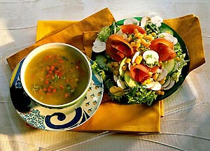 蔬菜沙拉炒加玉米浓汤。金牛MM可是地道的美食家,食物不仅要观感更要味觉,这份小零餐她们是否满意呢?有火腿搭配黄瓜,香菇和小生菜的沙拉,以及玉米和鸡丝调和的浓汤,口感自然不在话下,而卖相,我不多说,自有定论啦。